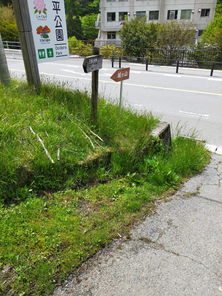 駐車場に車を停めたら、道を渡って大井平公園へ向かいます。ありがたいことに、公衆トイレもありますので、トイレが近い方ご安心ください!!そこから少し上に行くと登山口がありますので、登っていきます。