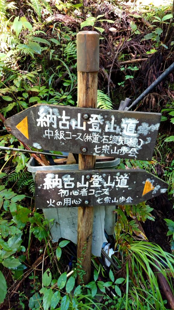 今回はロック・ガーデンひちそうから徒歩で納古山登山道(中級コース)登山口へ行き、中級コースを通ってアタックしました。帰りは尾根ルートというのも選択可能なようです。他にも初心者コースという道を選択できたり、別の登山口からアタックするルートもあるようですが中級コースで行った感想としてはとても良かったので、中級コース、おススメです。